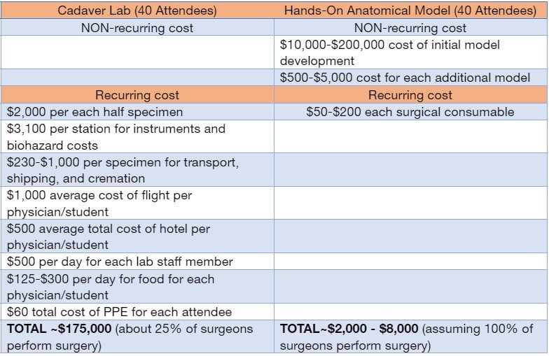 Although both cadaver labs and hands-on models require initial costs, the savings from the lack of recurring costs of hands-on models make the “break-even” point quickly realized.