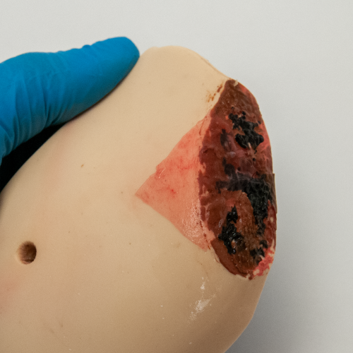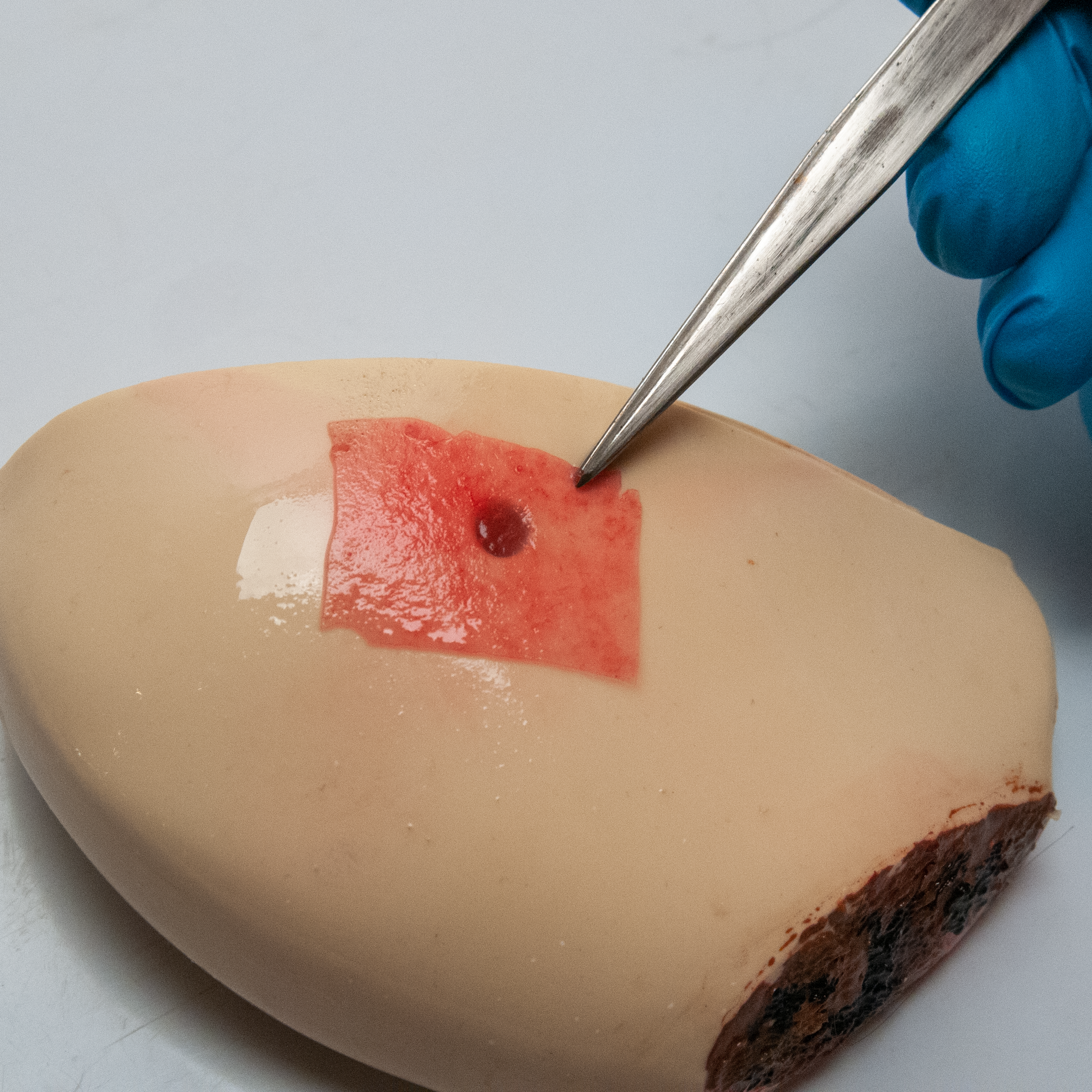 Did you know that amniotic membrane used to treat wounds is .070-.150 mm thick? Just to give you some reference, a single piece of copy paper is .010 mm thick. Our model makers created hundreds of samples before arriving at some that lived up to our testing and expectations. Durability, thickness, color, tear strength, elongation, and ability to unfold were just some of the properties and behaviors we were balancing. For example, a higher tear strength increases durability but inhibits realistic tissue movement.