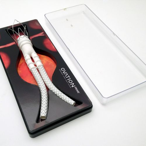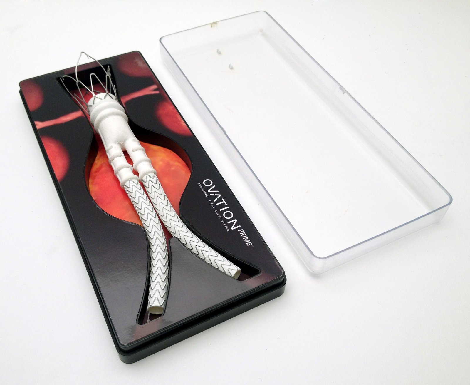 All the manufacturing process used to make the real stent were changed to processes that are more economical. Instead of wire-reinforced fabric, Pulse MDM created molded plastic tubes with silver decoration to represent the wire. The sharp and dangerous to handle cage at the top was replaced with a metal stamping with softer edges for safe handling. The stent is flexible for demonstration and discussion. And the replica easily pops in and out of the aneurysm shaped well in the custom & branded display case.