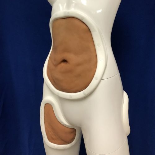 The basic model architecture capitalized on using stock, life-sized mannequins with pocketed areas where “fat pads” could be placed. Using stock mannequins enabled a huge savings over making an entirely customized body. The wide variety of fat types and the variance among where they reside on the body — chin, arms, belly, hips, back, thigh, among others — meant that many fat targets would need to be developed. To accommodate the device manufacturer’s time and budgetary constraints, we started with the development of just two models, each with three fat pads exhibiting the targeted fat presentations requested by the client. In all, the six fat pads integrated into two models would enable the device training on approximately 12 conditions the client wished to present to the clinicians for training.