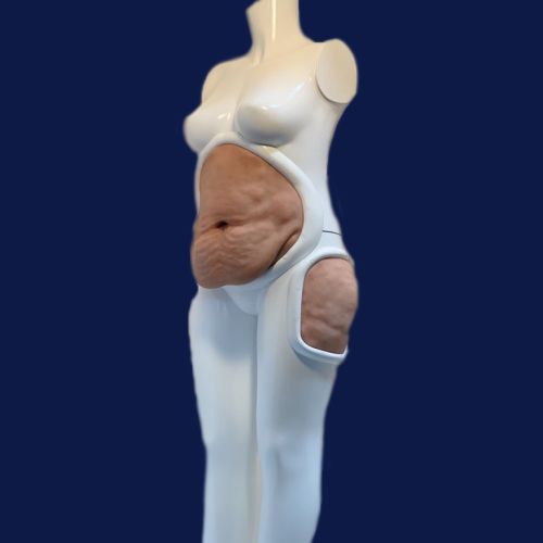 Replicating the fat shapes was relatively straight forward. Asymmetrical, post-liposuction irregularities, or drooping fat, among other formations, were replicated by our skilled sculptor using client-supplied images. More challenging however was to replicate the feel of the fat formations. Fat can feel dimpled, pliable, fibrous, uneven, lax, stiff, or any combination thereof. Many, many material samples using a multitude of recipes and additives were developed, sampled, and sent to the customer for evaluation and feedback. Who knew that the feeling of fat deposits was as complex and nuanced as a sommelier explaining the characteristics of fine wine?