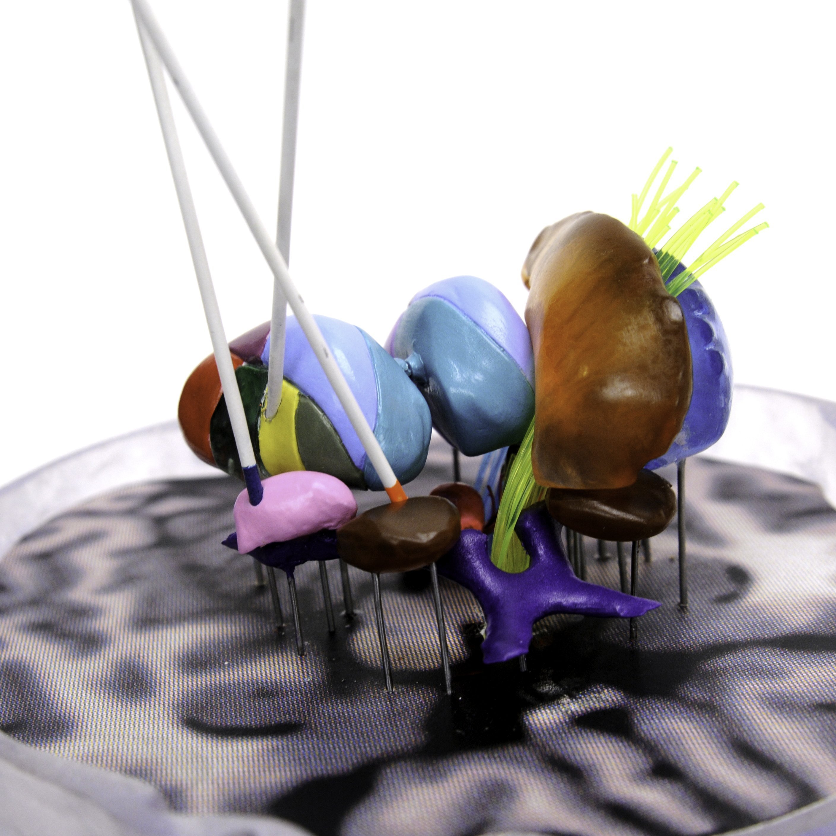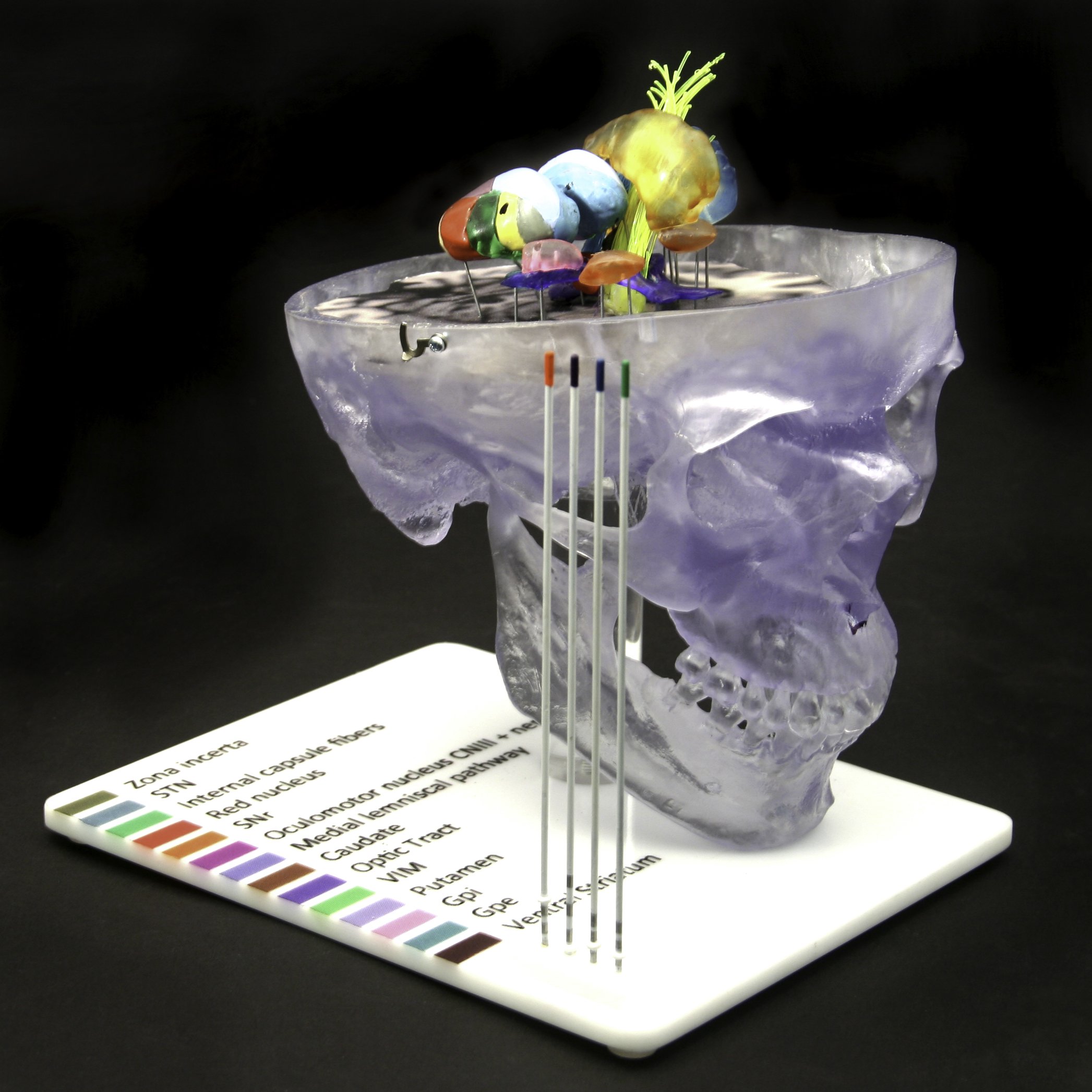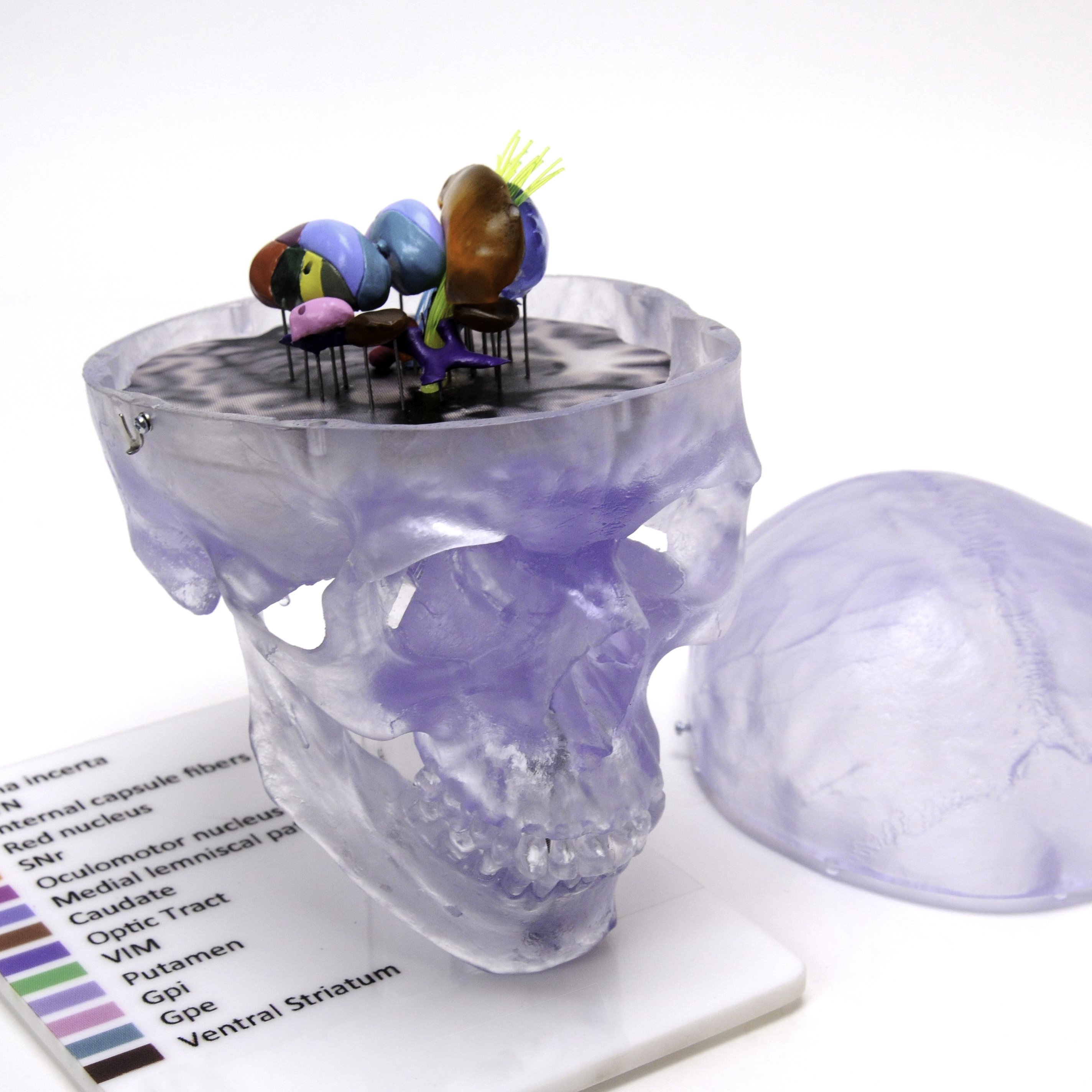 Pulse MDM planned a horizontal plane to represent the “floor” of the brain that all the structures could be mounted to. We proposed making the targeted brain components in different colors to differentiate them from one another. The component colors would then be used as a reference for the key on the model base that named all the structures. And in order to see structures that were behind larger ones, we would choose translucent materials.