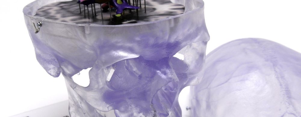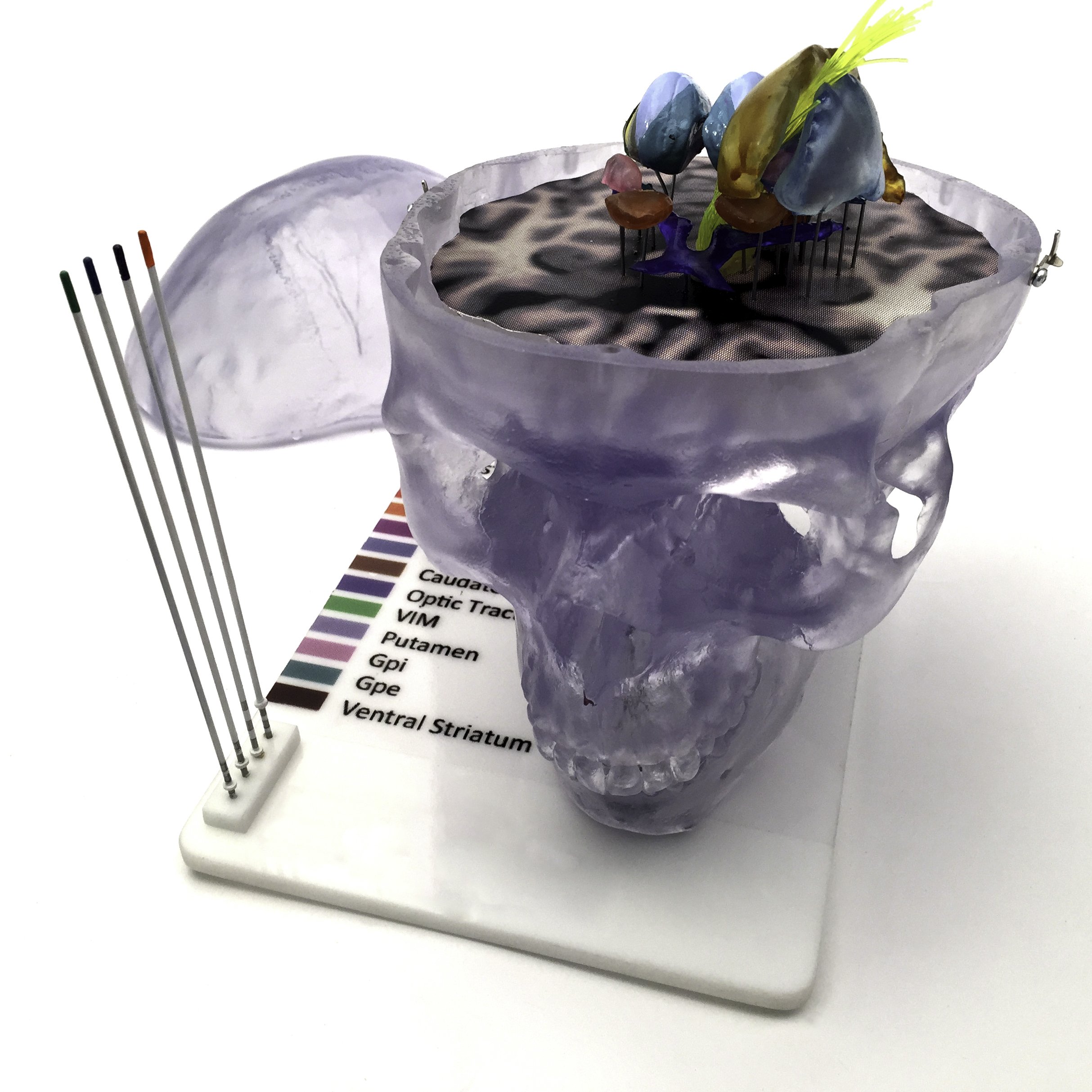 Using our client’s supplied data for the hypothalamus, Pulse MDM simplified the forms into discrete shapes and located them in the correct relationship to each other. We sourced a gorgeous clear stock skull model to provide context. And we created replicas of the client’s probes that fit into recesses in the base.