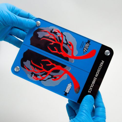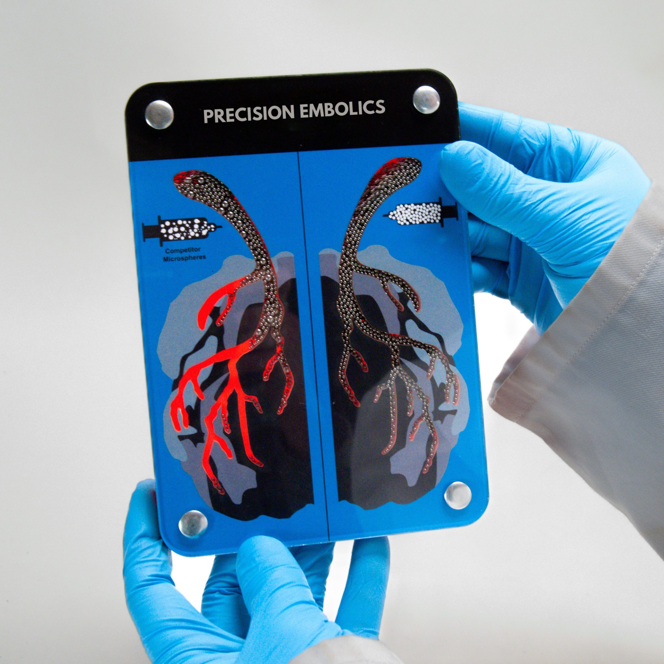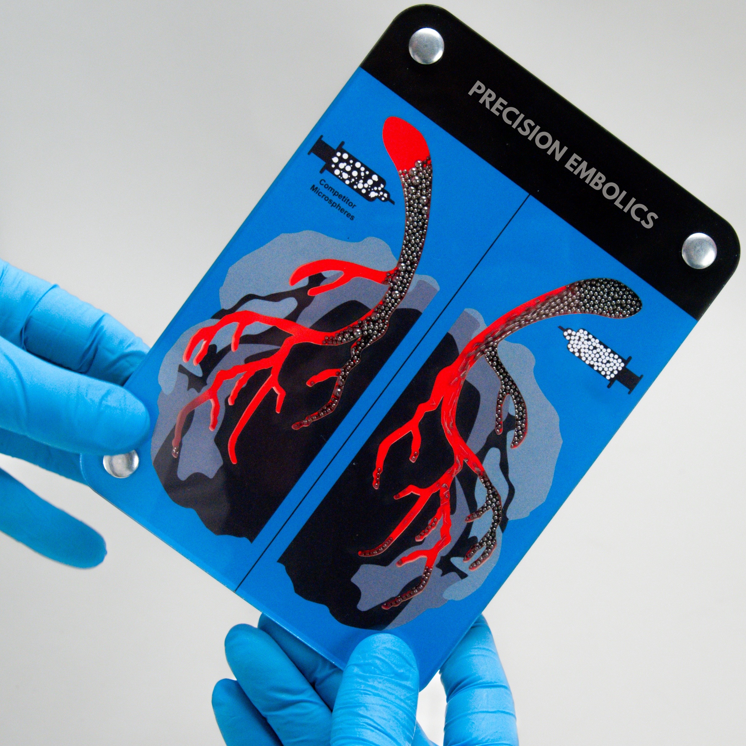 This client needed a custom embolization demonstration model for sales demos, clinical training, patient education, and trade shows. Embolization is a minimally invasive treatment that blocks one or more blood vessels or abnormal vascular channels, preventing blood flow to certain areas. Our client’s key differentiator is that their precisely calibrated microspheres allow for controlled embolization. Essentially, their embolic microspheres are more uniform in size. This seemed like an unexciting differentiator at first. But, we learned from our client that uniformity is a big deal. Once Pulse MDM understood the merits of microsphere uniformity, we saw the project’s creative potential, and we were super excited to help communicate our new understanding to our client’s mission.