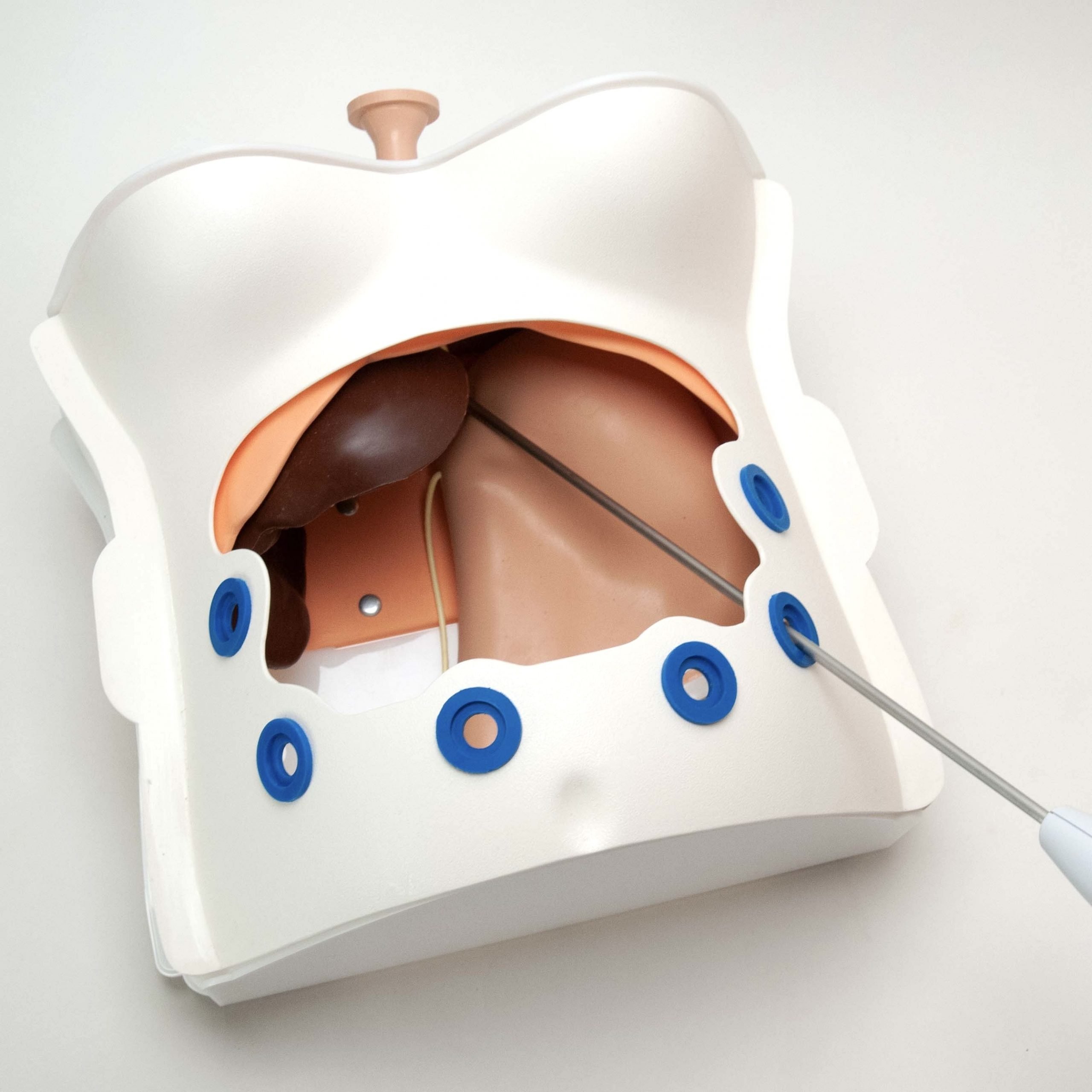 The must-have specification included a crural defect, esophagus, stomach, diaphragm, liver, and vagus nerve as it runs posterior to the esophagus. The abdomen is shaped in a permanently insufflated position with the posterior portion removed to easily see the targeted anatomy without the need for cumbersome visualization equipment. The esophagus can be set to replicate a hiatal hernia and pulled down to its’ proper position during the training. All the organs were planned to be realistically soft except for the diaphragm and outer skin. These parts were rigid to provide structure and to fixture the other organs in place.