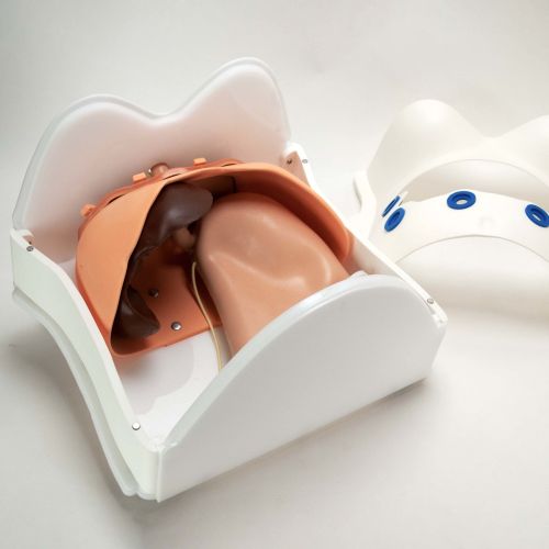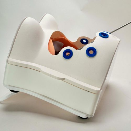 The model provides the clinical scenario to demonstrate surgical technique without the use of a cadaver, enabling the practice of measuring and placing the client’s device at the lower esophageal sphincter (LES). The surgeons can pull the hiatal hernia back into the abdomen, mobilize the esophagus, identify the LES, dissect between the posterior esophagus and posterior vagus nerve, laparoscopically match the device to the esophageal diameter, place the device through the dissected eyelet at the posterior esophagus and complete the necessary fit adjustments. The window in the abdomen precludes the need for expensive and bulky visualization equipment, making it even more convenient to train in the field.