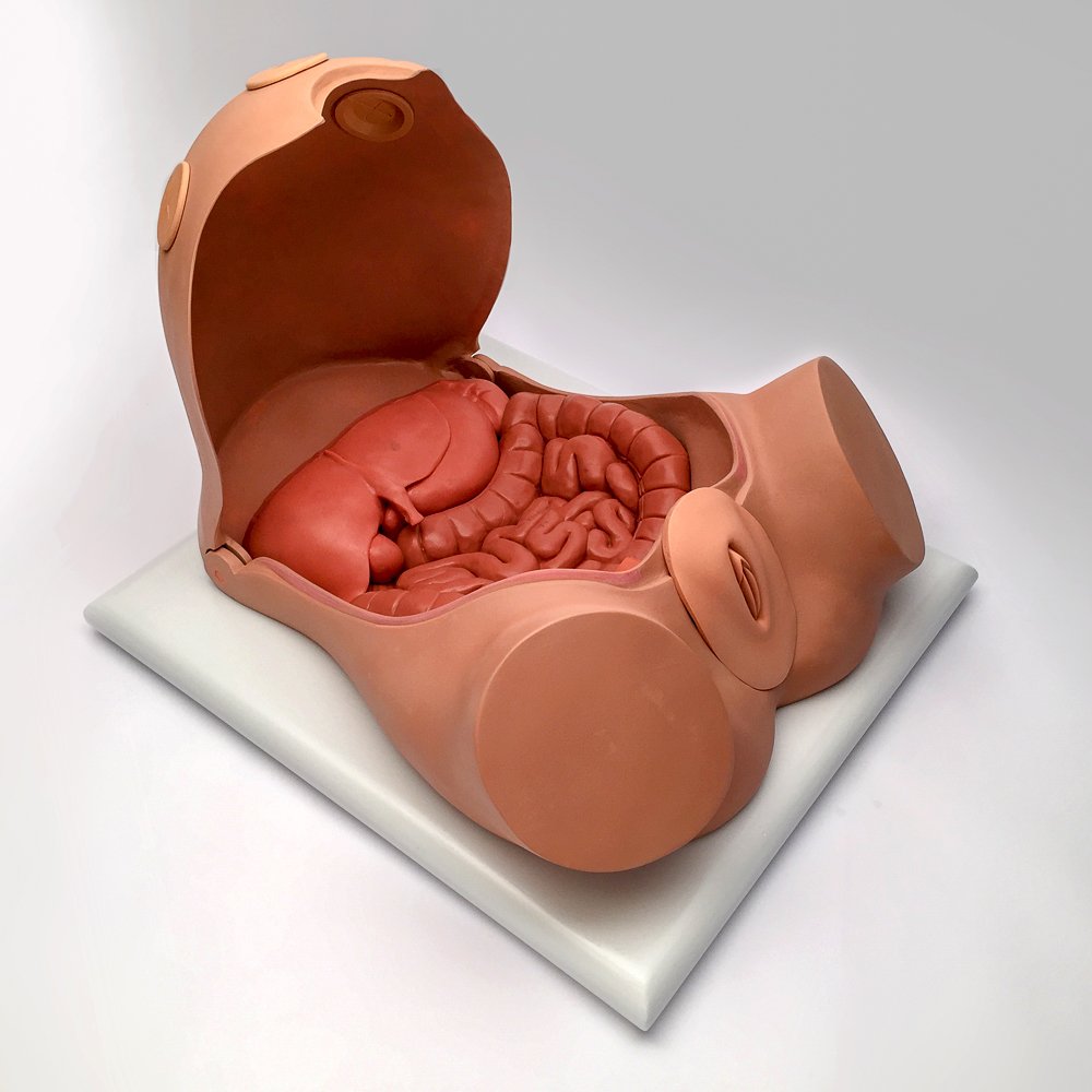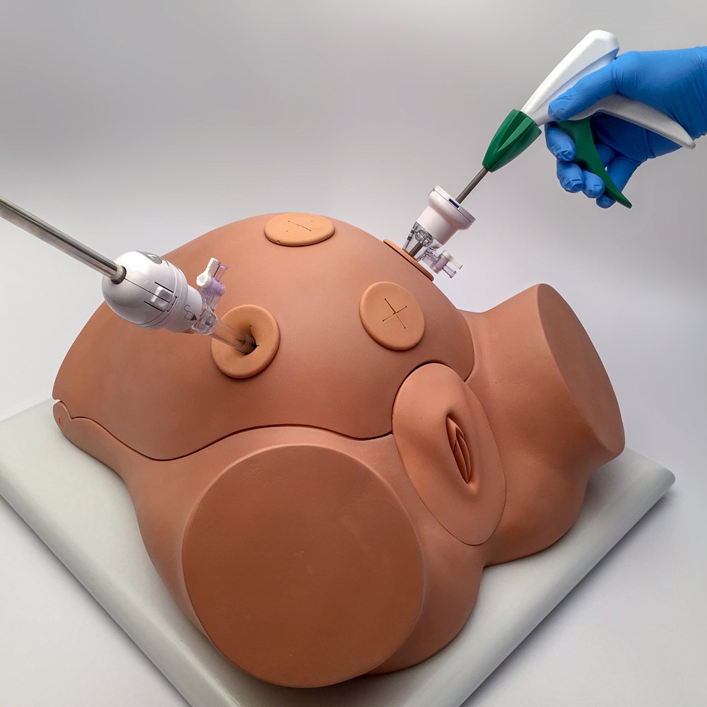 The outside anatomy torso, a permanently insufflated stomach/belly lid, three soft skin ports placed in your preferred locations, modified female genitalia with one opening.