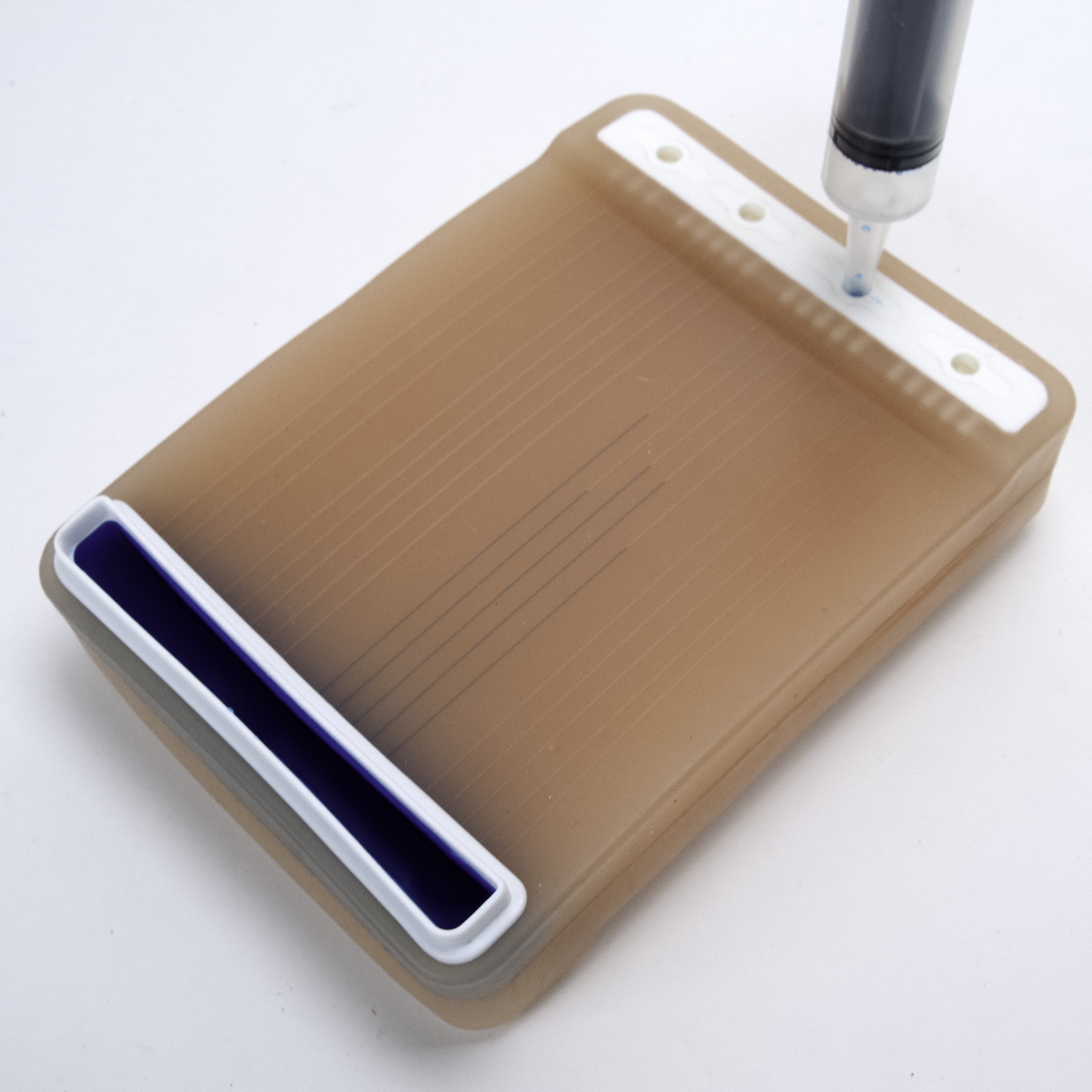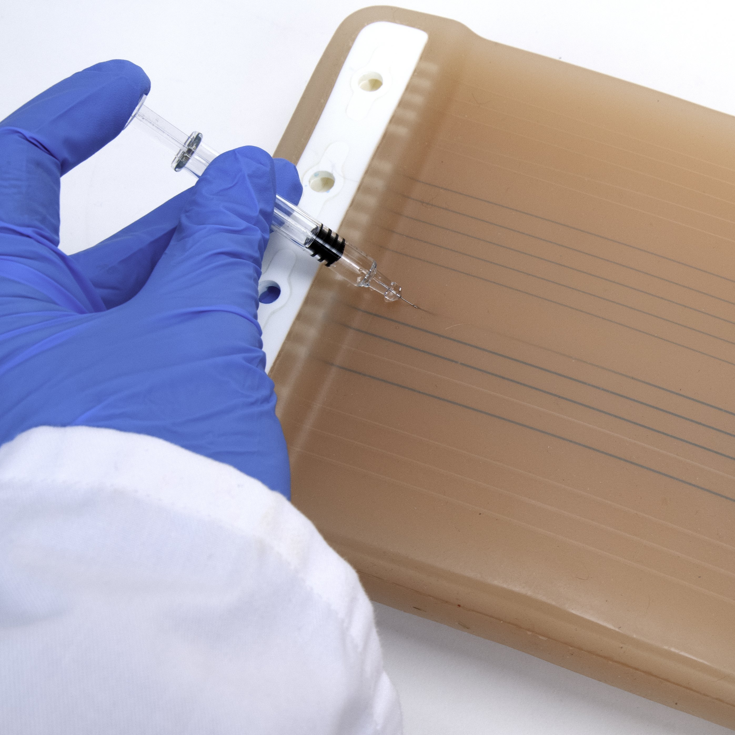 Pulse MDM began the project by creating abbreviated test models to submit to the client medical director for evaluation and feedback. Several iterations were required to refine a manufacturing method that would allow for vessels that are smaller than a strand of hair. The client asked that the tissue plate be rounded like a patient’s leg. The more clinically accurate scenario was complicated by needing to execute the tiny vessels in a curved shape. With some clever thinking Pulse MDM designed a curved base for the tissue block to bend over. This choice required a less complicated manufacturing process, making the production units much more economical.