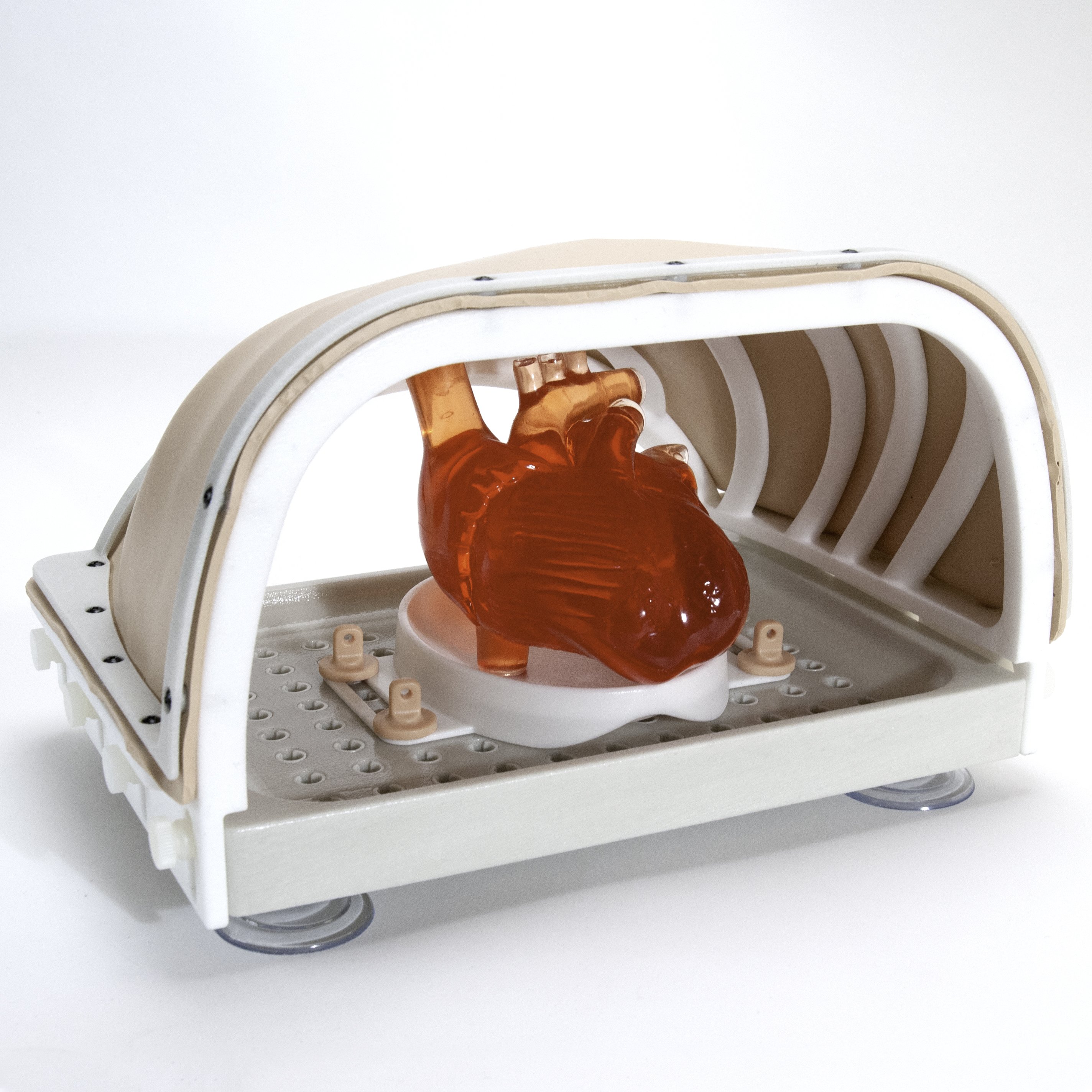 Our medical device research and development engineering clients envisioned a modular platform for the testing of suture placement and fastening during cardiac valve replacement surgery. Their targeted anatomy was heart, aorta, ribs, and skin. They planned to use either ex vivo porcine hearts or a heart model.  They wanted replaceable skin which they would be incising, and they needed a flexible platform that allowed for the heart to be attached to the model in different locations.