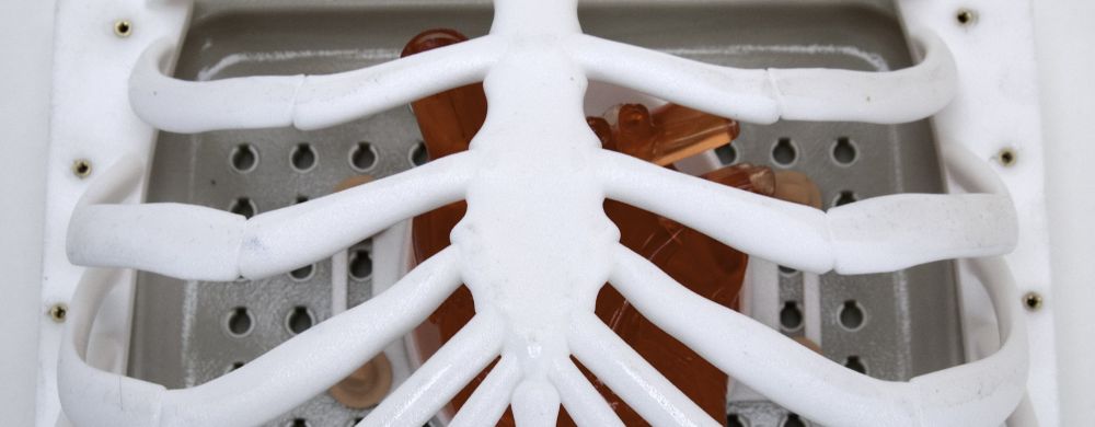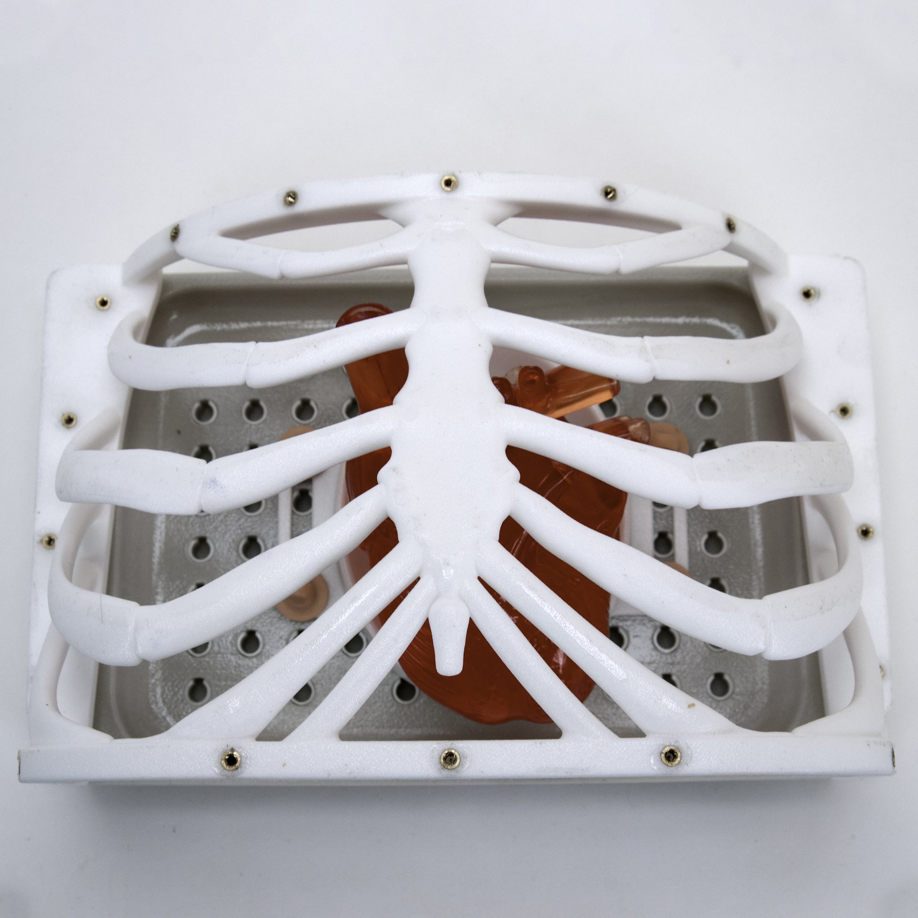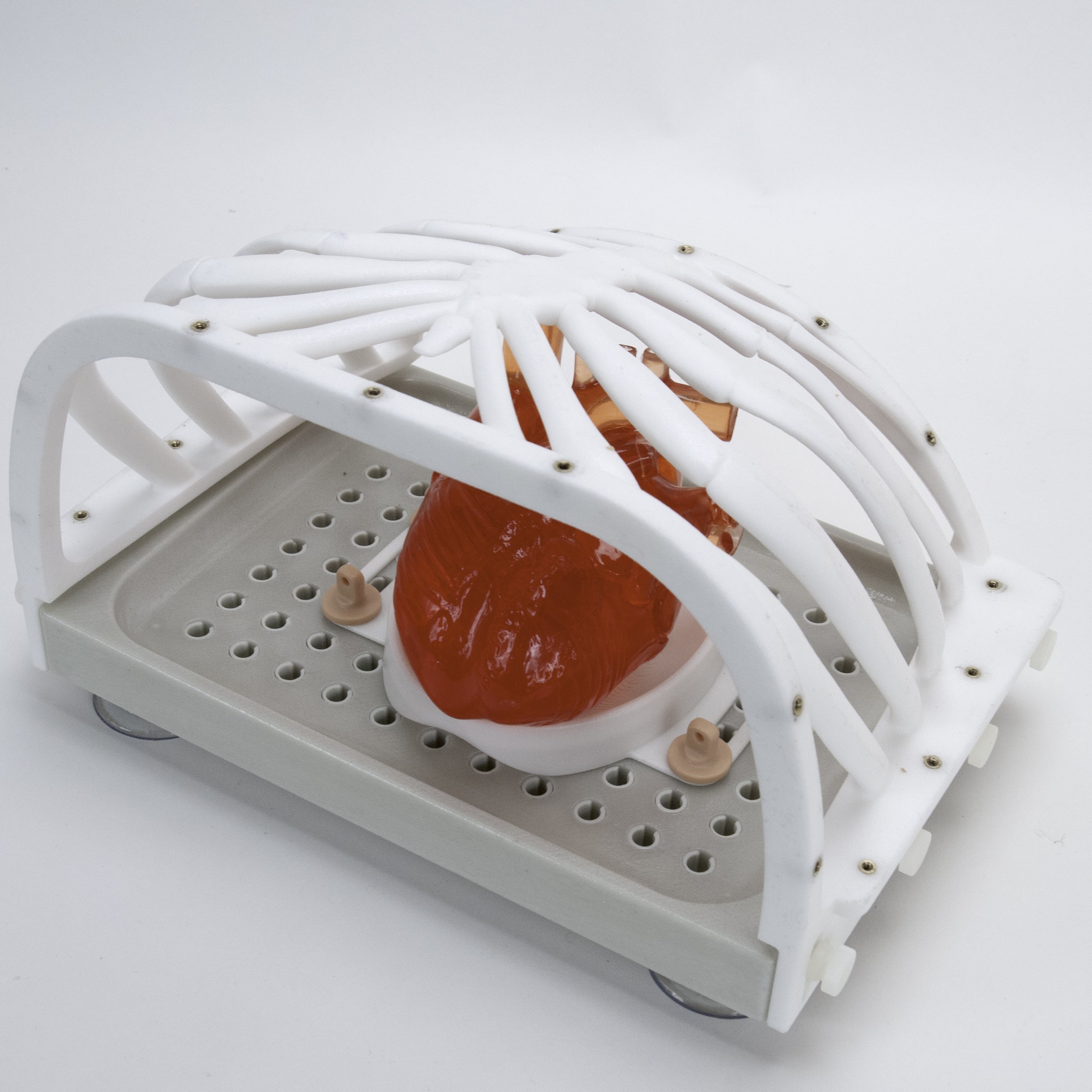Pulse MDM designed a tray to hold the ex vivo hearts and a peg system to facilitate moving the tray to different locations. As the client planned to use live tissue, the model was free of small cervices or slots so it could be easily cleaned. A fastening system was devised to hold the skin firmly in place during use and facilitate easy replacement for a fresh incision each time.