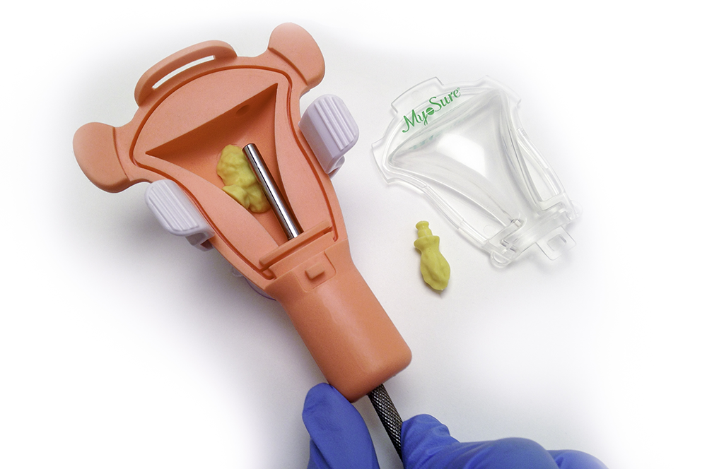 Create a model that has 3 types of uterine fibroids to show how the Myosure device can remove fibroids from any location in the uterus.