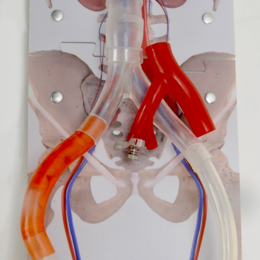 The May-Thurner obstruction was created by replicating the iliac vein’s soft lumen expansion and conformability in highly dynamic anatomy, overlapped by a small portion of the iliac artery. A thumb screw on the artery was assembled into a slotted hole in a clear support so the degree of impingement can be easily and subtly shifted to create different clinical scenarios. The vessel was planned to be clear to see the Zilver Vena stent in situ. Using the Pulse MDM model, clinicians can practice the steps leading up to stent deployment and observe how the stent restores the lumen to fully round and reestablishes blood flow to the heart. The model enables quick and easy removal of the stent for rapid repeat training exercises.