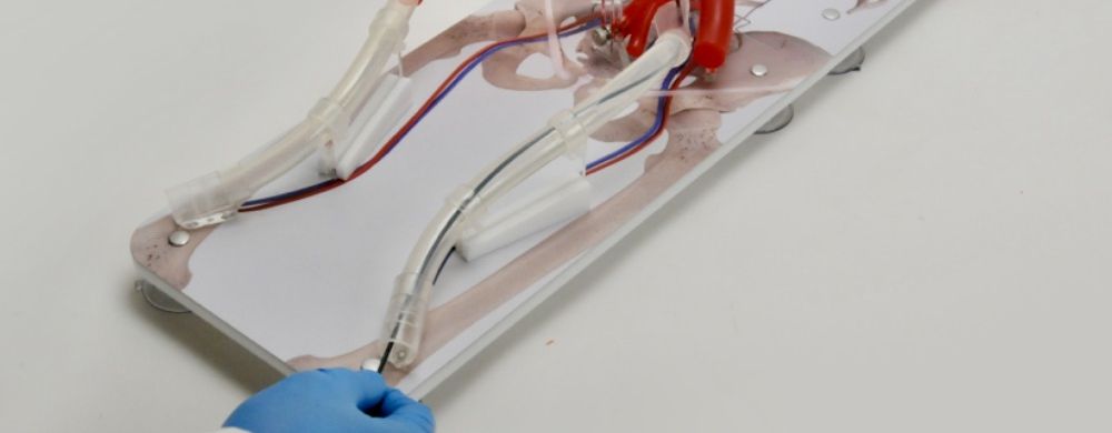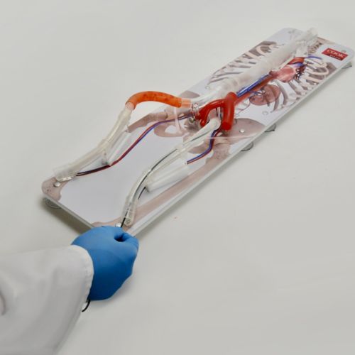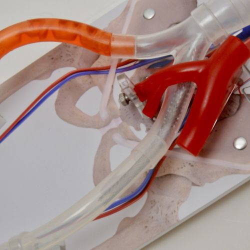Due to the length of the model, from the interior jugular to the popliteal near the knee, the model is split in half for portability and easily connects back together for seamless vessel cannulation.