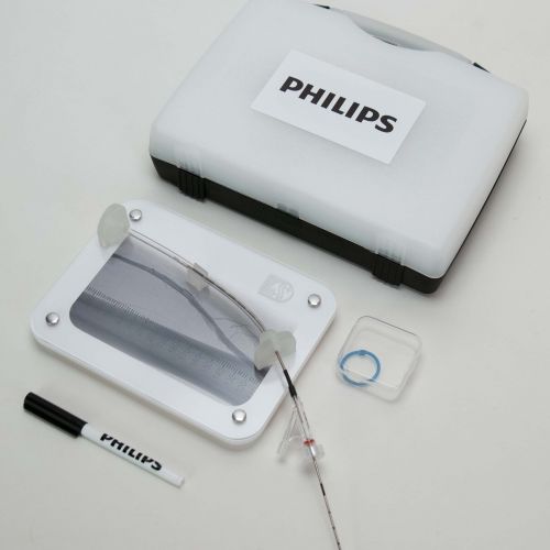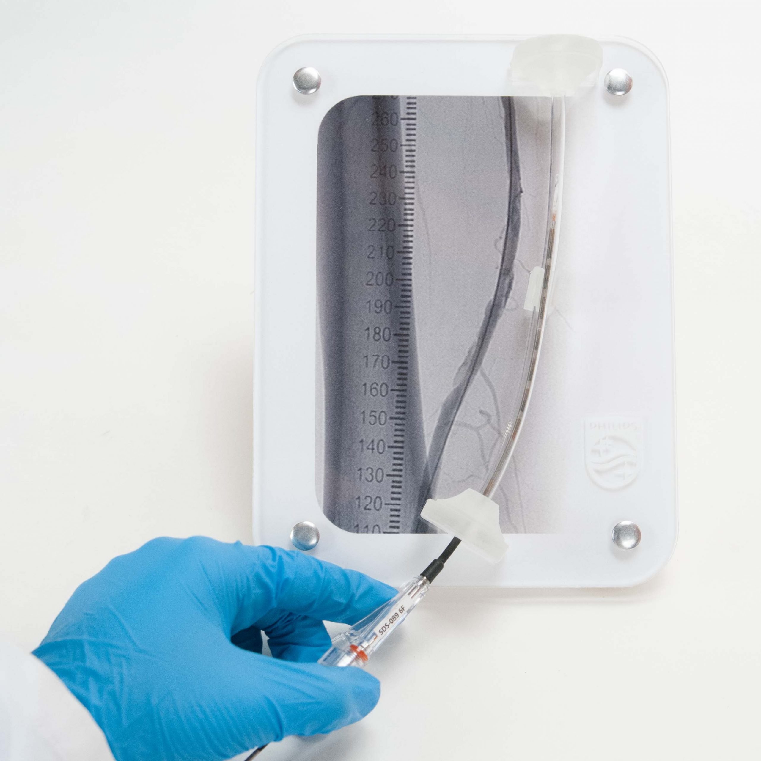 In addition to the accelerated delivery, Pulse MDM added their own criteria.  We wanted the model to be compact for easy transport and use by sales representatives.  It had to display the client’s branding in an effective, though unobtrusive way.  Graphically, we opted to display fluoroscopic background imagery to mimic the visual ecosystem a surgeon would experience during a procedure and to provide context.   Pulse planned for a sale rep kit that included a storage compartment to hold used vessels that had been tacked, and a supply of fresh vessels for later use.